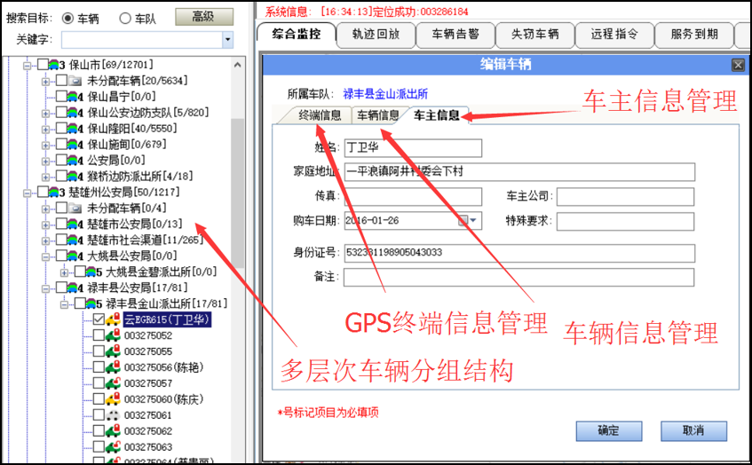 多级车队管理:按省市县等行政区域划分的多级分组管理,提供多层次管理账户,功能及权限可以配置;