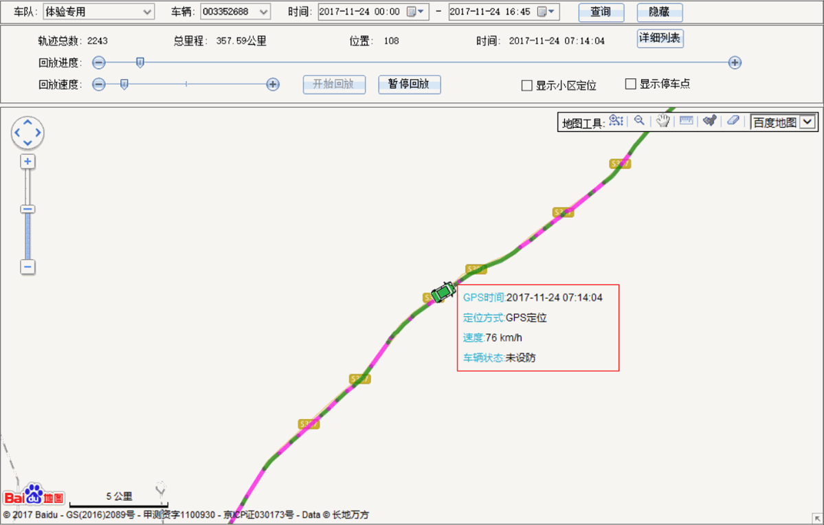 历史轨迹:可以随时调取车辆过去任何一个时段的完整轨迹,分析车主的行踪。